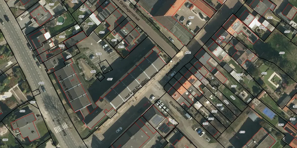 Het perceel waarop Hof Van Eynatten 9 staat heeft een oppervlakte van 3010 m². Dit is een zeer groot perceel. De perceeloppervlakte wordt geregistreerd door het Kadaster. Gedetailleerde informatie over de maten van dit perceel kunt u vinden in het rapport Kadastrale kaart met maatvoering van Hof Van Eynatten 9.