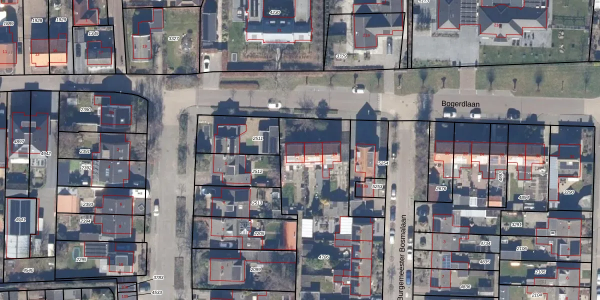 Het perceel waarop Bogerdlaan 10 staat heeft een oppervlakte van 1845 m². Dit is een zeer groot perceel. De perceeloppervlakte wordt geregistreerd door het Kadaster. Gedetailleerde informatie over de maten van dit perceel kunt u vinden in het rapport Kadastrale kaart met maatvoering van Bogerdlaan 10.