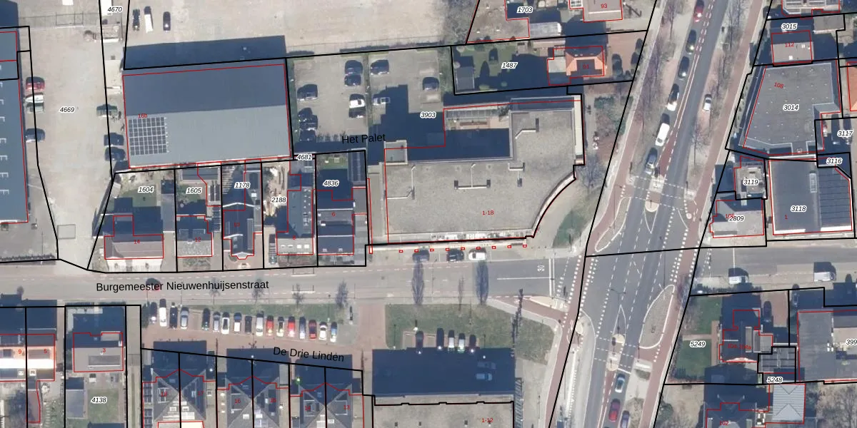 Het perceel waarop Het Palet 13 staat heeft een oppervlakte van 2256 m². Dit is een zeer groot perceel. De perceeloppervlakte wordt geregistreerd door het Kadaster. Gedetailleerde informatie over de maten van dit perceel kunt u vinden in het rapport Kadastrale kaart met maatvoering van Het Palet 13.