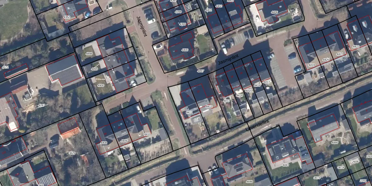 Het perceel waarop Jasmijnlint 24 staat heeft een oppervlakte van 362 m². Dit is een groot perceel. De perceeloppervlakte wordt geregistreerd door het Kadaster. Gedetailleerde informatie over de maten van dit perceel kunt u vinden in het rapport Kadastrale kaart met maatvoering van Jasmijnlint 24.