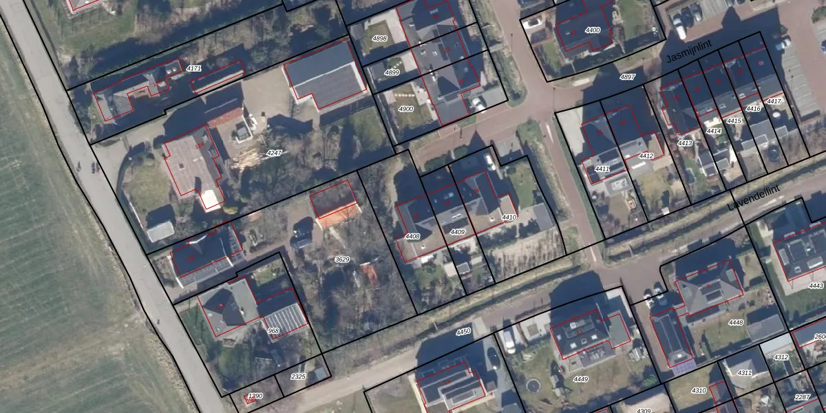 Het perceel waarop Jasmijnlint 30 staat heeft een oppervlakte van 500 m². Dit is een groot perceel. De perceeloppervlakte wordt geregistreerd door het Kadaster. Gedetailleerde informatie over de maten van dit perceel kunt u vinden in het rapport Kadastrale kaart met maatvoering van Jasmijnlint 30.