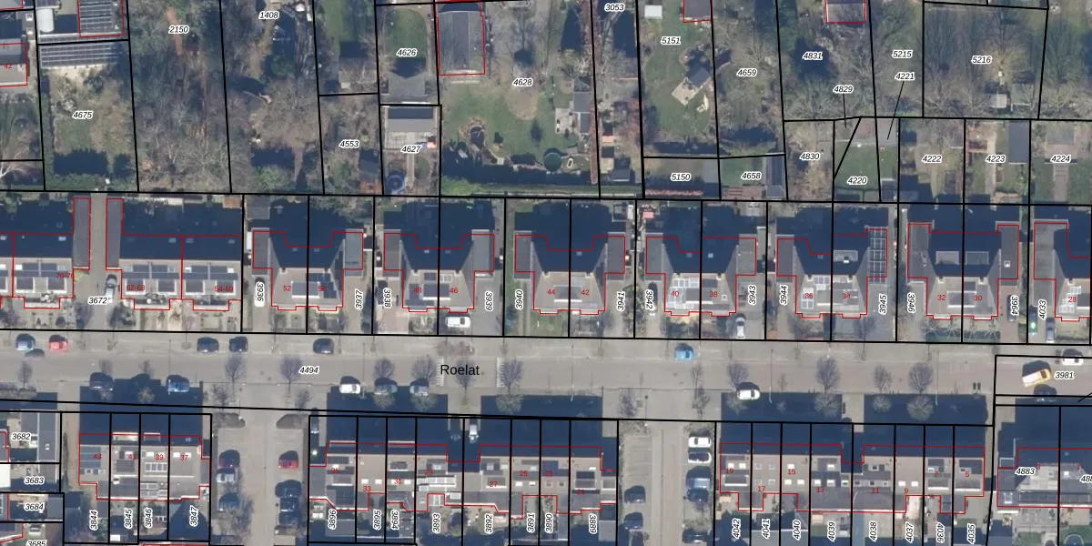 Het perceel waarop Roelat 44 staat heeft een oppervlakte van 305 m². Dit is een groot perceel. De perceeloppervlakte wordt geregistreerd door het Kadaster. Gedetailleerde informatie over de maten van dit perceel kunt u vinden in het rapport Kadastrale kaart met maatvoering van Roelat 44.