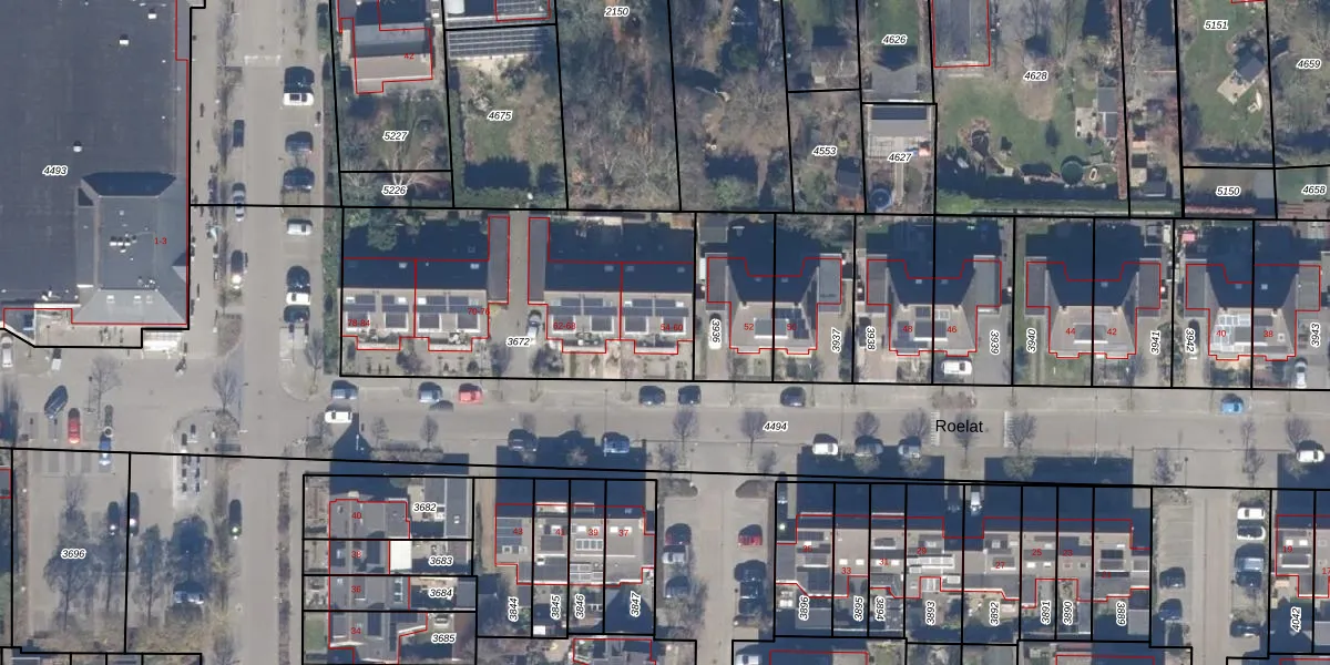 Het perceel waarop Roelat 54 staat heeft een oppervlakte van 1350 m². Dit is een zeer groot perceel. De perceeloppervlakte wordt geregistreerd door het Kadaster. Gedetailleerde informatie over de maten van dit perceel kunt u vinden in het rapport Kadastrale kaart met maatvoering van Roelat 54.