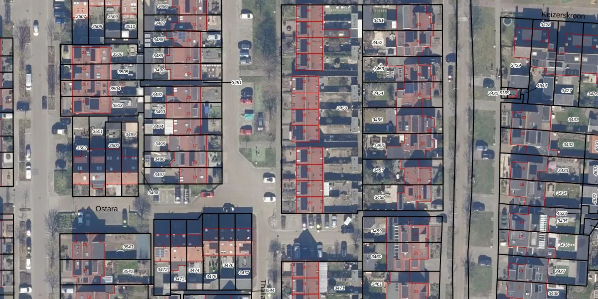 Het perceel waarop Thalia 24 staat heeft een oppervlakte van 1893 m². Dit is een zeer groot perceel. De perceeloppervlakte wordt geregistreerd door het Kadaster. Gedetailleerde informatie over de maten van dit perceel kunt u vinden in het rapport Kadastrale kaart met maatvoering van Thalia 24.