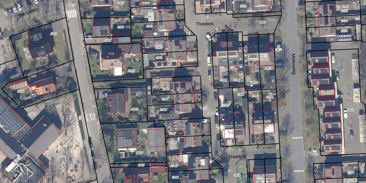 Het perceel waarop Theebos 20 staat heeft een oppervlakte van 250 m². Dit is een middelgroot perceel. De perceeloppervlakte wordt geregistreerd door het Kadaster. Gedetailleerde informatie over de maten van dit perceel kunt u vinden in het rapport Kadastrale kaart met maatvoering van Theebos 20.