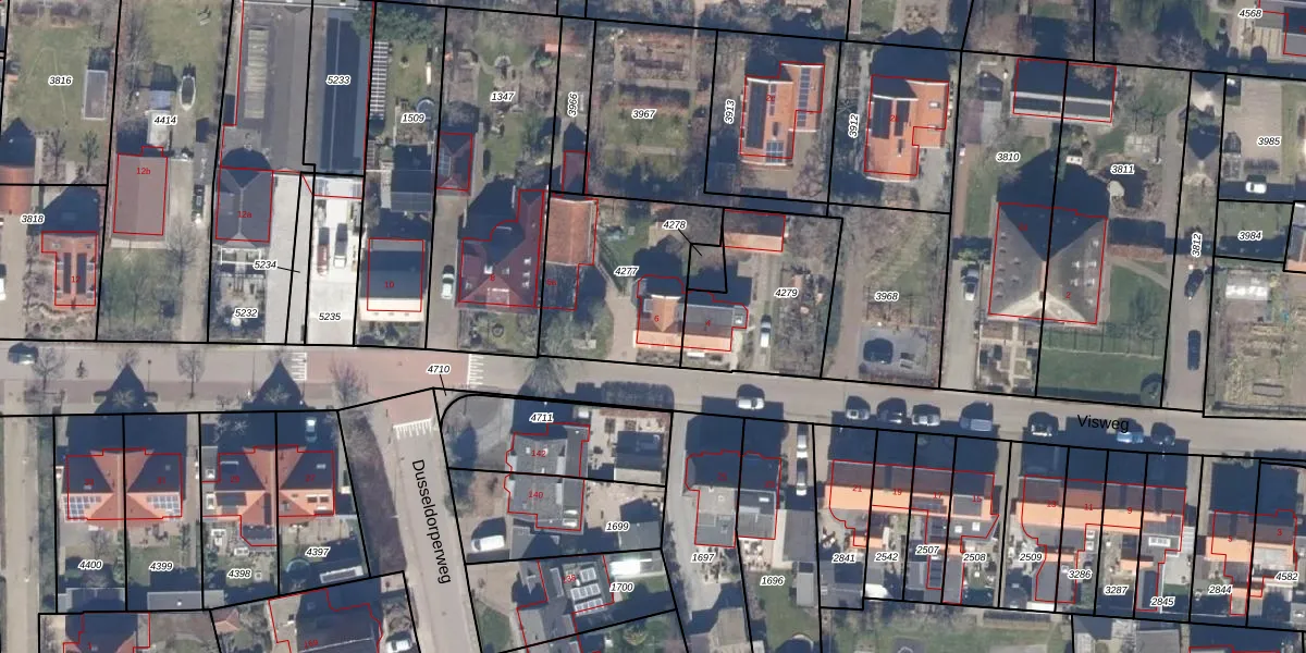 Het perceel waarop Visweg 6 staat heeft een oppervlakte van 596 m². Dit is een groot perceel. De perceeloppervlakte wordt geregistreerd door het Kadaster. Gedetailleerde informatie over de maten van dit perceel kunt u vinden in het rapport Kadastrale kaart met maatvoering van Visweg 6.