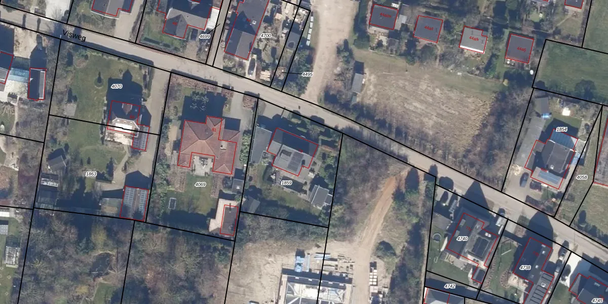 Het perceel waarop Visweg 79 staat heeft een oppervlakte van 1020 m². Dit is een zeer groot perceel. De perceeloppervlakte wordt geregistreerd door het Kadaster. Gedetailleerde informatie over de maten van dit perceel kunt u vinden in het rapport Kadastrale kaart met maatvoering van Visweg 79.