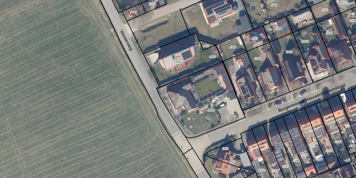 Westerweg 106 is gelegen op kadastraal perceel LMN00C3894. Deze kadastrale aanduiding is uniek en wordt gebruikt door het Kadaster om eigendomsrechten en andere zakelijke rechten vast te leggen. Het perceel maakt onderdeel uit van de kadastrale gemeente Limmen.