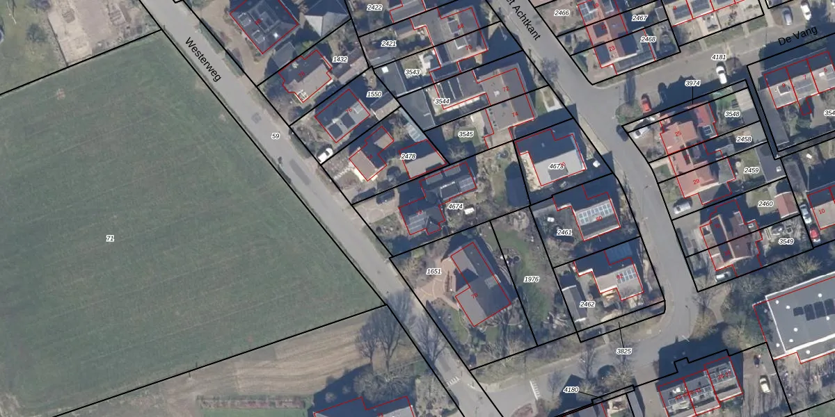 Het perceel waarop Westerweg 72 staat heeft een oppervlakte van 611 m². Dit is een groot perceel. De perceeloppervlakte wordt geregistreerd door het Kadaster. Gedetailleerde informatie over de maten van dit perceel kunt u vinden in het rapport Kadastrale kaart met maatvoering van Westerweg 72.