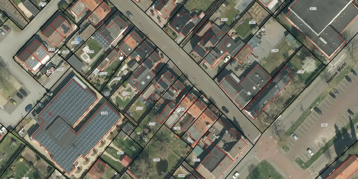 Het perceel waarop Marktstraat 19 staat heeft een oppervlakte van 465 m². Dit is een groot perceel. De perceeloppervlakte wordt geregistreerd door het Kadaster. Gedetailleerde informatie over de maten van dit perceel kunt u vinden in het rapport Kadastrale kaart met maatvoering van Marktstraat 19.