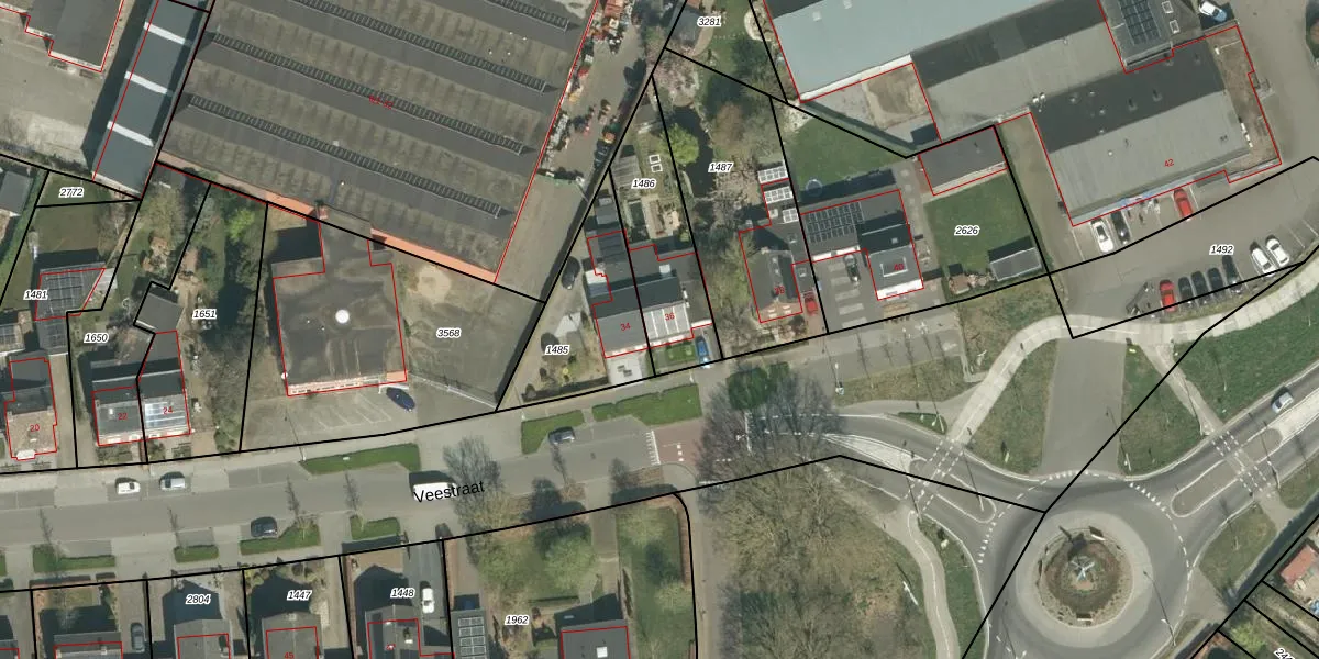 Het perceel waarop Veestraat 36 staat heeft een oppervlakte van 390 m². Dit is een groot perceel. De perceeloppervlakte wordt geregistreerd door het Kadaster. Gedetailleerde informatie over de maten van dit perceel kunt u vinden in het rapport Kadastrale kaart met maatvoering van Veestraat 36.