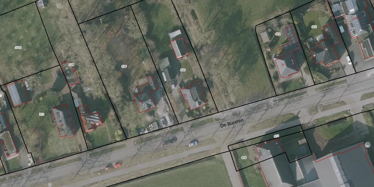 Het perceel waarop De Buorren 21 staat heeft een oppervlakte van 1495 m². Dit is een zeer groot perceel. De perceeloppervlakte wordt geregistreerd door het Kadaster. Gedetailleerde informatie over de maten van dit perceel kunt u vinden in het rapport Kadastrale kaart met maatvoering van De Buorren 21.