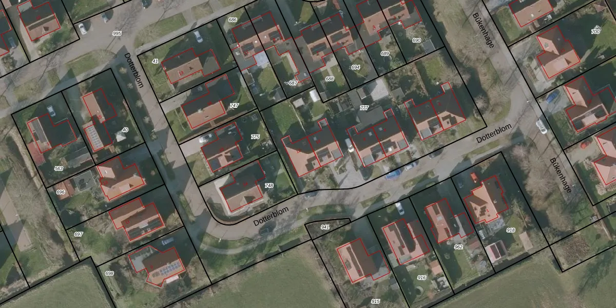 Het perceel waarop Dotterblom 12 staat heeft een oppervlakte van 1960 m². Dit is een zeer groot perceel. De perceeloppervlakte wordt geregistreerd door het Kadaster. Gedetailleerde informatie over de maten van dit perceel kunt u vinden in het rapport Kadastrale kaart met maatvoering van Dotterblom 12.
