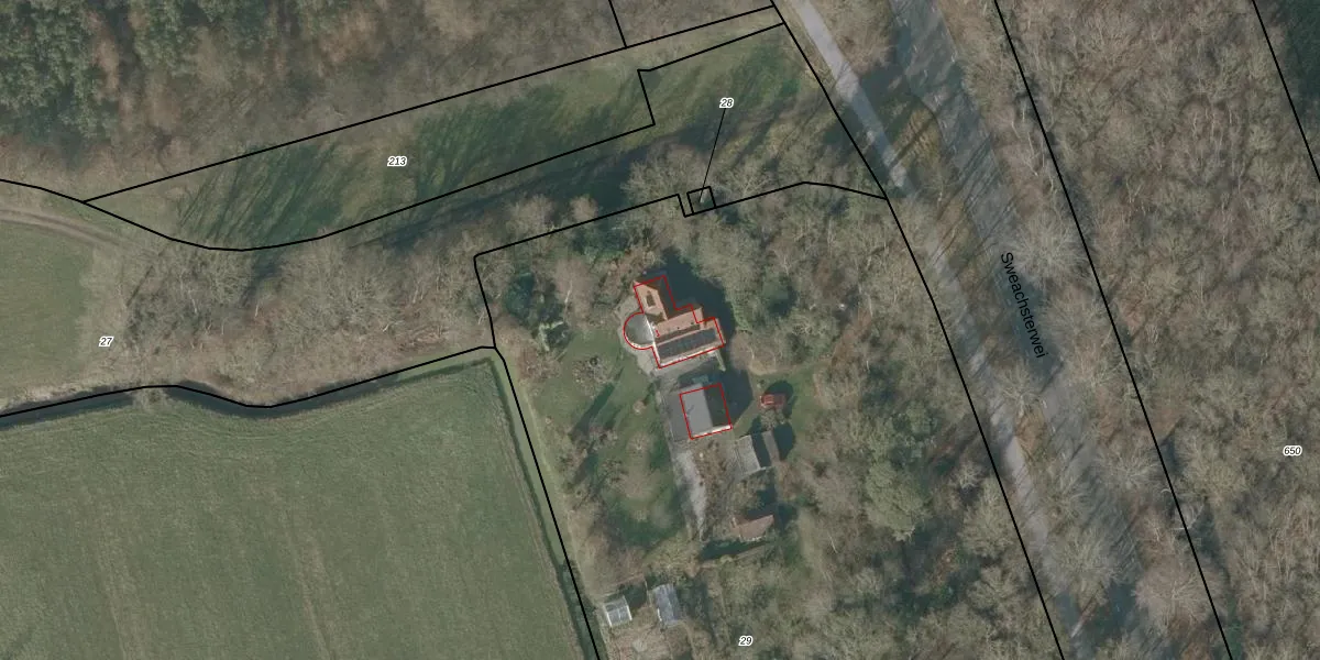 Het perceel waarop Sweachsterwei 1 staat heeft een oppervlakte van 7650 m². Dit is een zeer groot perceel. De perceeloppervlakte wordt geregistreerd door het Kadaster. Gedetailleerde informatie over de maten van dit perceel kunt u vinden in het rapport Kadastrale kaart met maatvoering van Sweachsterwei 1.