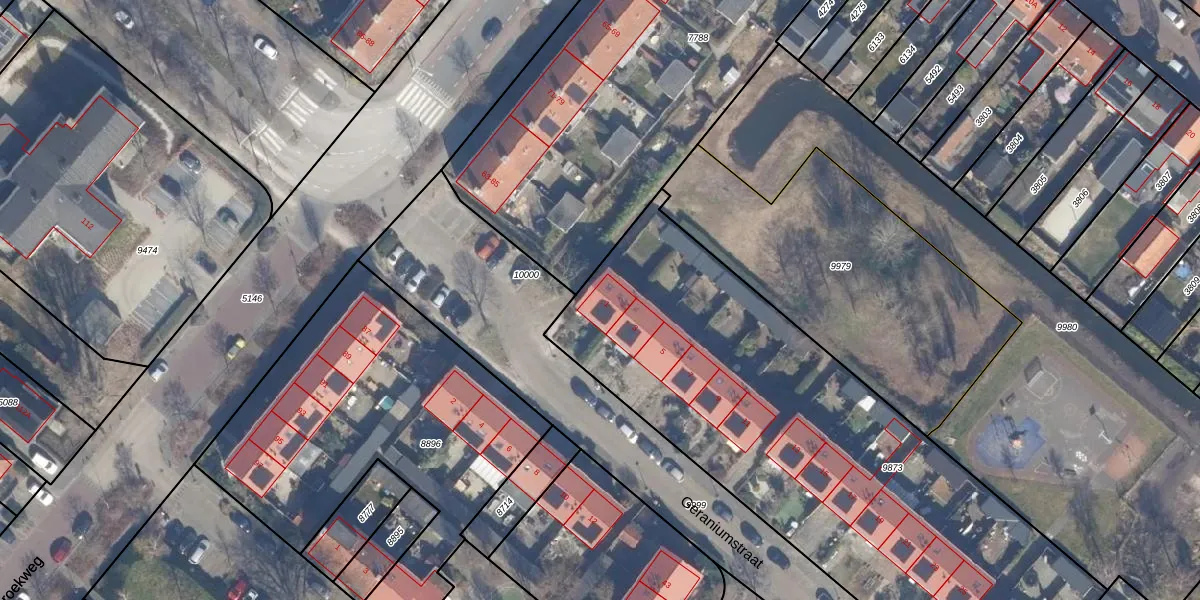 Het perceel waarop Geraniumstraat 1 staat heeft een oppervlakte van 2800 m². Dit is een zeer groot perceel. De perceeloppervlakte wordt geregistreerd door het Kadaster. Gedetailleerde informatie over de maten van dit perceel kunt u vinden in het rapport Kadastrale kaart met maatvoering van Geraniumstraat 1.