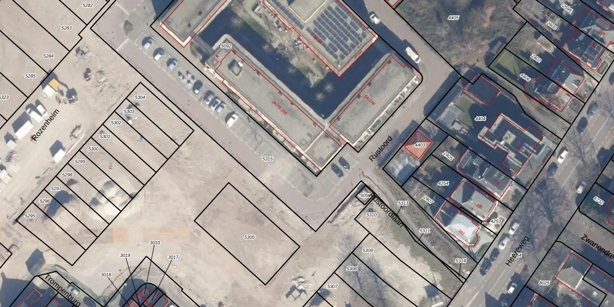 Het perceel waarop Rustoord 168 staat heeft een oppervlakte van 3705 m². Dit is een zeer groot perceel. De perceeloppervlakte wordt geregistreerd door het Kadaster. Gedetailleerde informatie over de maten van dit perceel kunt u vinden in het rapport Kadastrale kaart met maatvoering van Rustoord 168.
