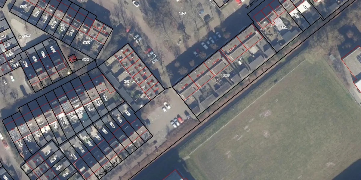 Het perceel waarop Voerman 94 staat heeft een oppervlakte van 1235 m². Dit is een zeer groot perceel. De perceeloppervlakte wordt geregistreerd door het Kadaster. Gedetailleerde informatie over de maten van dit perceel kunt u vinden in het rapport Kadastrale kaart met maatvoering van Voerman 94.