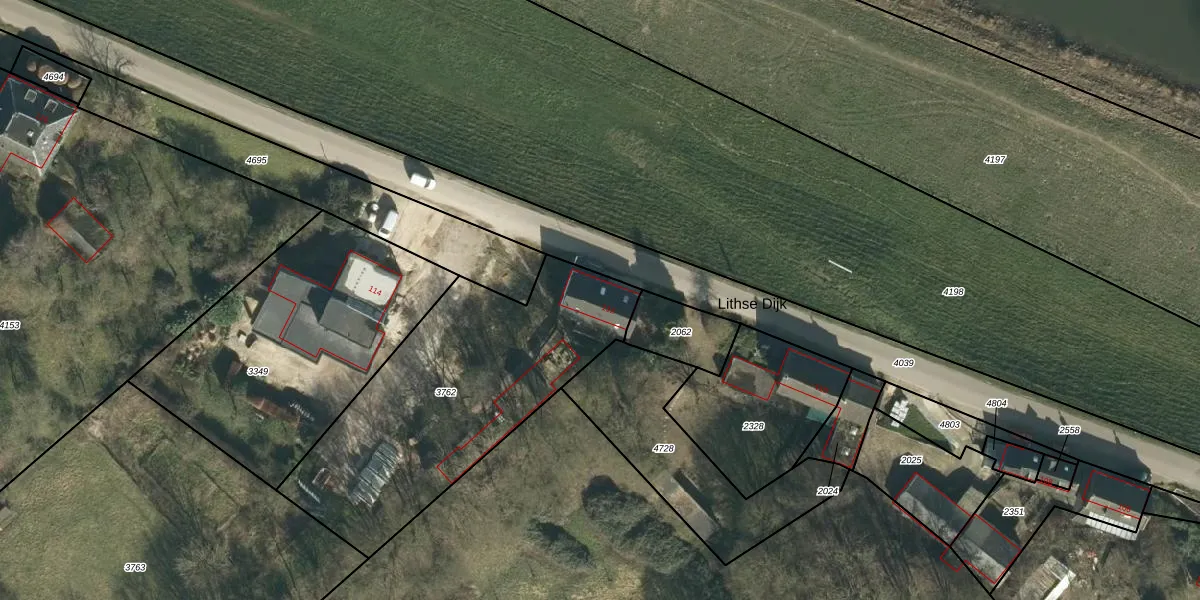 Lithse Dijk 112 is gelegen op kadastraal perceel LIT00A3762. Deze kadastrale aanduiding is uniek en wordt gebruikt door het Kadaster om eigendomsrechten en andere zakelijke rechten vast te leggen. Het perceel maakt onderdeel uit van de kadastrale gemeente Lith.