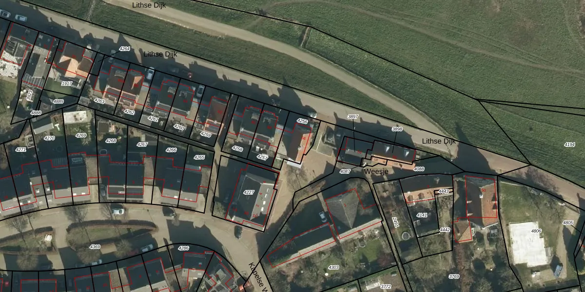Lithse Dijk 56 is gelegen op kadastraal perceel LIT00A4256. Deze kadastrale aanduiding is uniek en wordt gebruikt door het Kadaster om eigendomsrechten en andere zakelijke rechten vast te leggen. Het perceel maakt onderdeel uit van de kadastrale gemeente Lith.