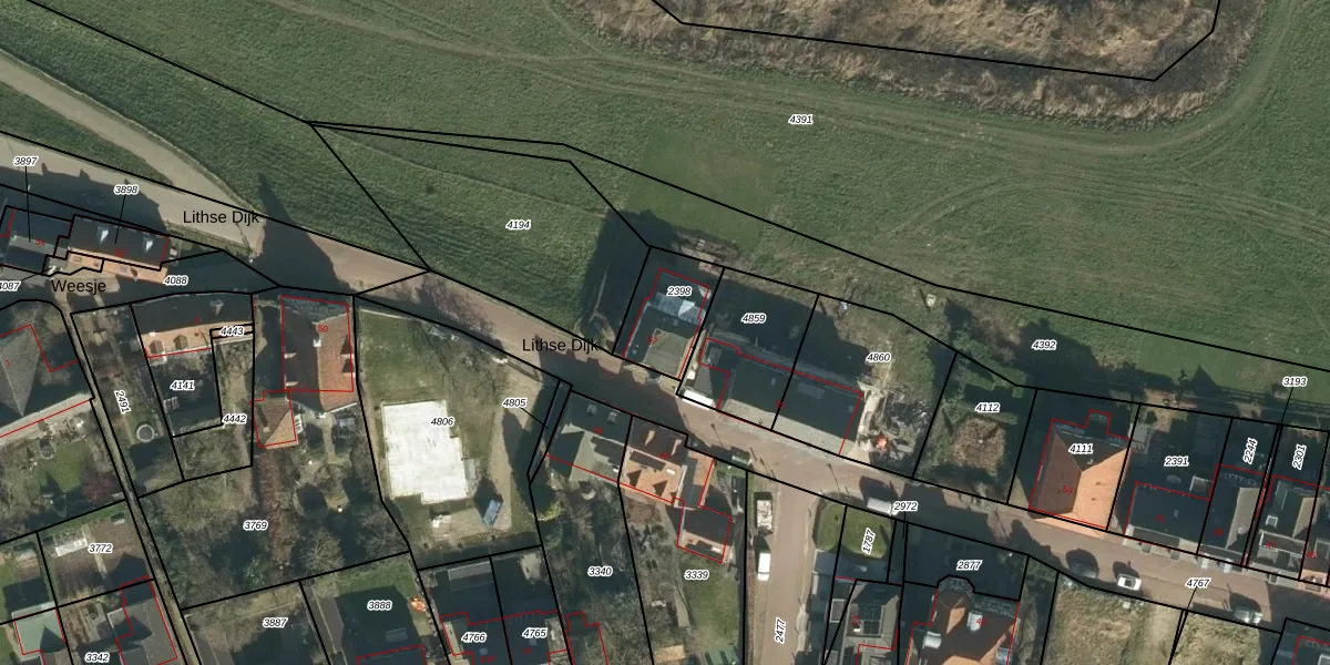 Lithse Dijk 57 is gelegen op kadastraal perceel LIT00A2398. Deze kadastrale aanduiding is uniek en wordt gebruikt door het Kadaster om eigendomsrechten en andere zakelijke rechten vast te leggen. Het perceel maakt onderdeel uit van de kadastrale gemeente Lith.
