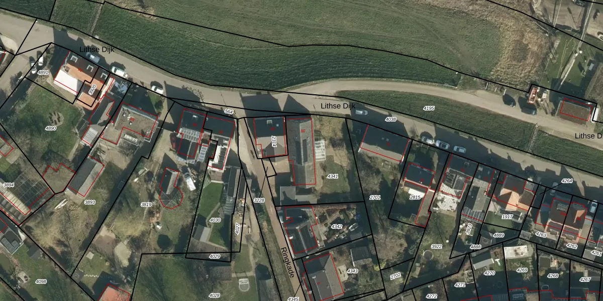 Lithse Dijk 80 is gelegen op kadastraal perceel LIT00A4341. Deze kadastrale aanduiding is uniek en wordt gebruikt door het Kadaster om eigendomsrechten en andere zakelijke rechten vast te leggen. Het perceel maakt onderdeel uit van de kadastrale gemeente Lith.