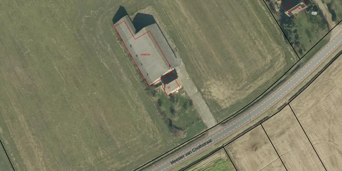 Het perceel waarop Meester van Coothstraat 59 staat heeft een oppervlakte van 3,8 ha. Dit is een zeer groot perceel. De perceeloppervlakte wordt geregistreerd door het Kadaster. Gedetailleerde informatie over de maten van dit perceel kunt u vinden in het rapport Kadastrale kaart met maatvoering van Meester van Coothstraat 59.