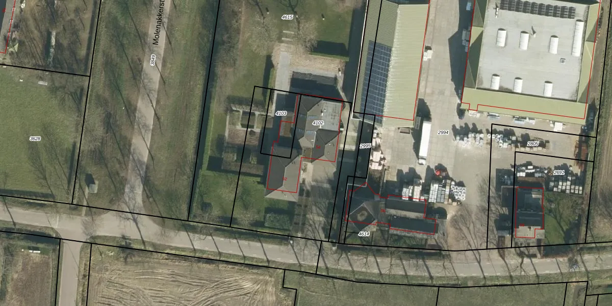 Het perceel waarop Molenstraat 54 staat heeft een oppervlakte van 1284 m². Dit is een zeer groot perceel. De perceeloppervlakte wordt geregistreerd door het Kadaster. Gedetailleerde informatie over de maten van dit perceel kunt u vinden in het rapport Kadastrale kaart met maatvoering van Molenstraat 54.