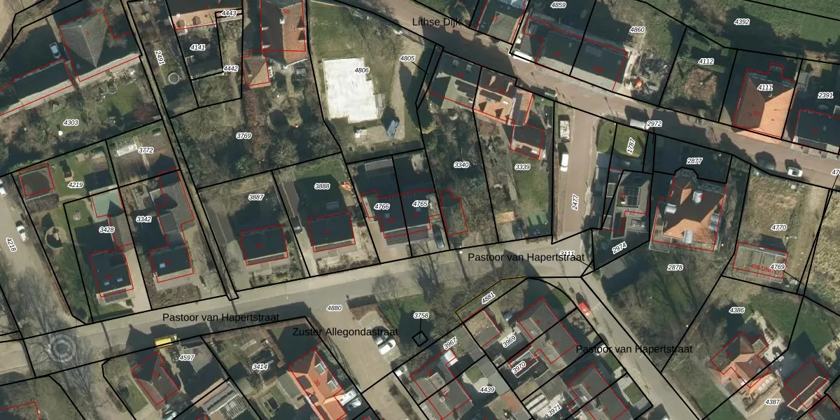 Pastoor van Hapertstraat 15 is gelegen op kadastraal perceel LIT00A4765. Deze kadastrale aanduiding is uniek en wordt gebruikt door het Kadaster om eigendomsrechten en andere zakelijke rechten vast te leggen. Het perceel maakt onderdeel uit van de kadastrale gemeente Lith.