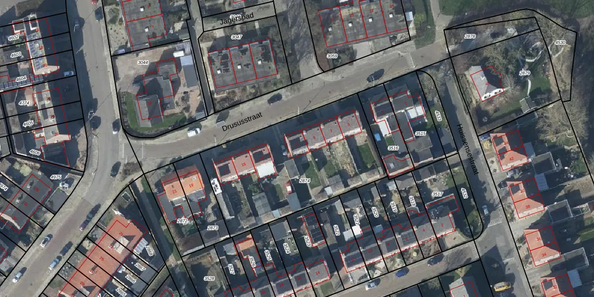 Het perceel waarop Drususstraat 11 staat heeft een oppervlakte van 1710 m². Dit is een zeer groot perceel. De perceeloppervlakte wordt geregistreerd door het Kadaster. Gedetailleerde informatie over de maten van dit perceel kunt u vinden in het rapport Kadastrale kaart met maatvoering van Drususstraat 11.