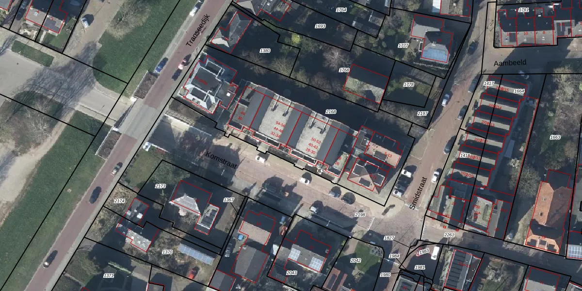 Het perceel waarop Komstraat 30 staat heeft een oppervlakte van 2125 m². Dit is een zeer groot perceel. De perceeloppervlakte wordt geregistreerd door het Kadaster. Gedetailleerde informatie over de maten van dit perceel kunt u vinden in het rapport Kadastrale kaart met maatvoering van Komstraat 30.