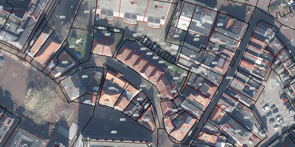 Het perceel waarop Bagijnestraat 17 staat heeft een oppervlakte van 975 m². Dit is een groot perceel. De perceeloppervlakte wordt geregistreerd door het Kadaster. Gedetailleerde informatie over de maten van dit perceel kunt u vinden in het rapport Kadastrale kaart met maatvoering van Bagijnestraat 17.