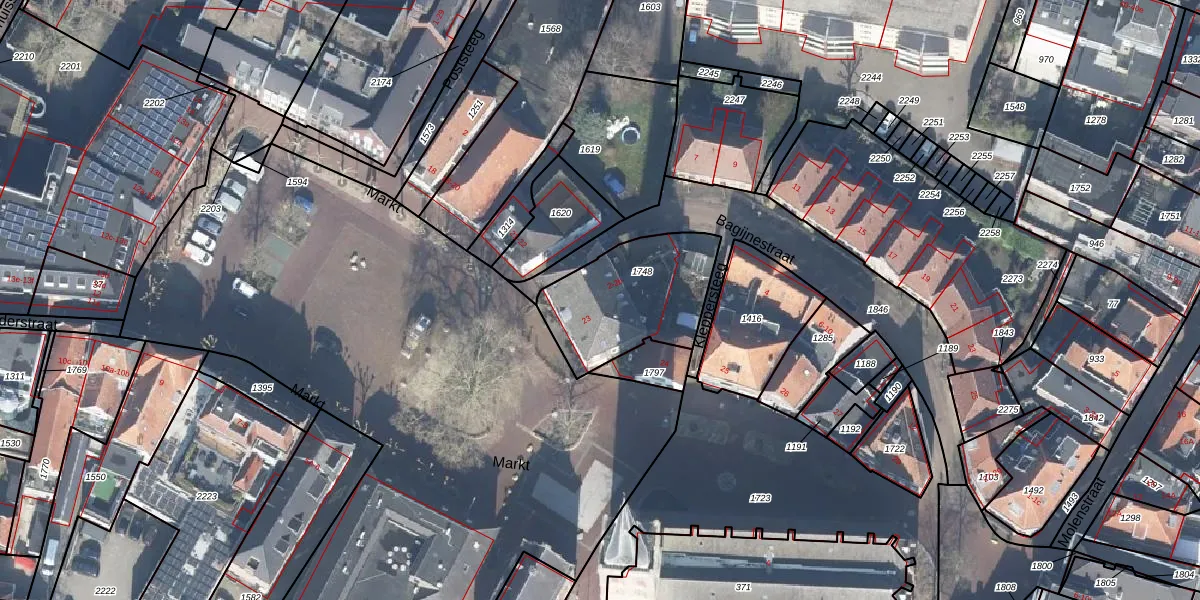 Het perceel waarop Bagijnestraat 2-a staat heeft een oppervlakte van 450 m². Dit is een groot perceel. De perceeloppervlakte wordt geregistreerd door het Kadaster. Gedetailleerde informatie over de maten van dit perceel kunt u vinden in het rapport Kadastrale kaart met maatvoering van Bagijnestraat 2-a.