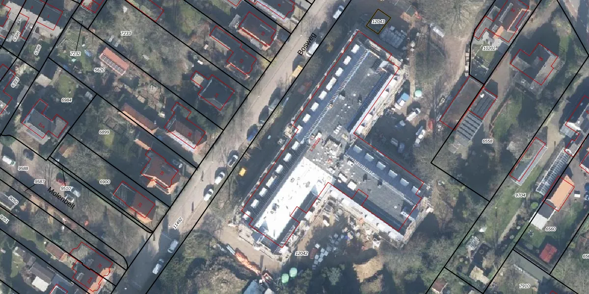 Het perceel waarop Bosweg 1-K003 staat heeft een oppervlakte van 1,6 ha. Dit is een zeer groot perceel. De perceeloppervlakte wordt geregistreerd door het Kadaster. Gedetailleerde informatie over de maten van dit perceel kunt u vinden in het rapport Kadastrale kaart met maatvoering van Bosweg 1-K003.