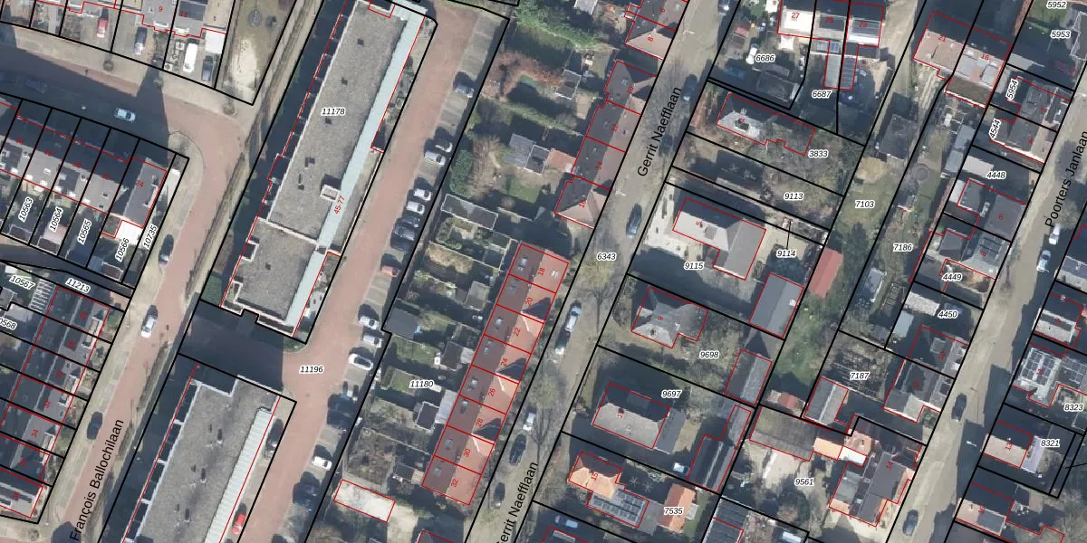 Het perceel waarop Gerrit Naefflaan 18 staat heeft een oppervlakte van 5664 m². Dit is een zeer groot perceel. De perceeloppervlakte wordt geregistreerd door het Kadaster. Gedetailleerde informatie over de maten van dit perceel kunt u vinden in het rapport Kadastrale kaart met maatvoering van Gerrit Naefflaan 18.