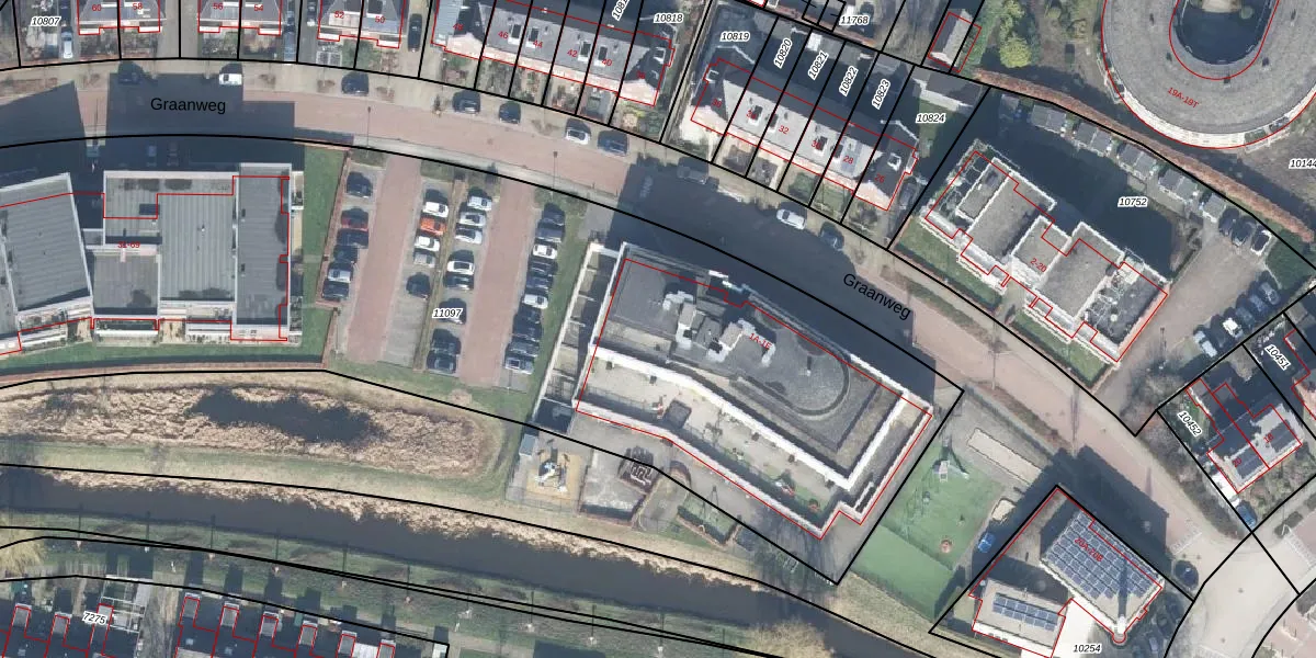 Het perceel waarop Graanweg 1-a staat heeft een oppervlakte van 5590 m². Dit is een zeer groot perceel. De perceeloppervlakte wordt geregistreerd door het Kadaster. Gedetailleerde informatie over de maten van dit perceel kunt u vinden in het rapport Kadastrale kaart met maatvoering van Graanweg 1-a.
