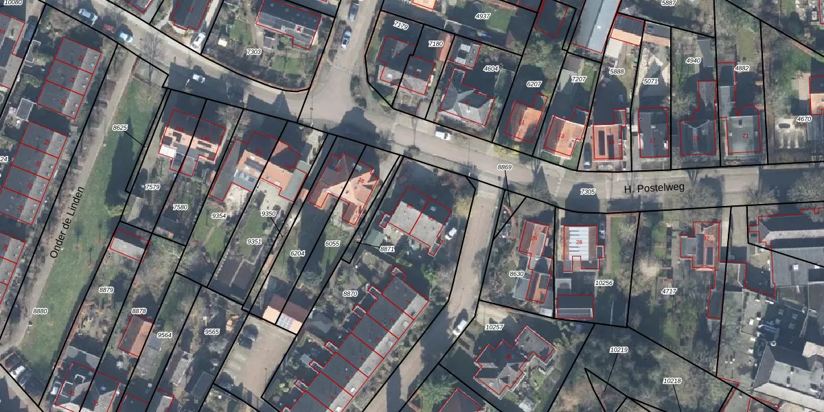 Het perceel waarop H. Postelweg 20 staat heeft een oppervlakte van 1710 m². Dit is een zeer groot perceel. De perceeloppervlakte wordt geregistreerd door het Kadaster. Gedetailleerde informatie over de maten van dit perceel kunt u vinden in het rapport Kadastrale kaart met maatvoering van H. Postelweg 20.