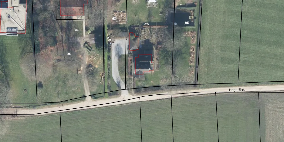 Het perceel waarop Hoge Enk 3 staat heeft een oppervlakte van 2650 m². Dit is een zeer groot perceel. De perceeloppervlakte wordt geregistreerd door het Kadaster. Gedetailleerde informatie over de maten van dit perceel kunt u vinden in het rapport Kadastrale kaart met maatvoering van Hoge Enk 3.