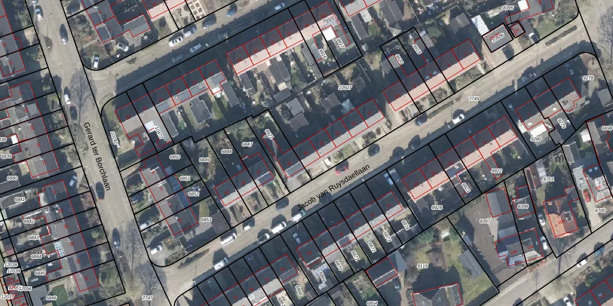 Het perceel waarop Jacob van Ruysdaellaan 20 staat heeft een oppervlakte van 5365 m². Dit is een zeer groot perceel. De perceeloppervlakte wordt geregistreerd door het Kadaster. Gedetailleerde informatie over de maten van dit perceel kunt u vinden in het rapport Kadastrale kaart met maatvoering van Jacob van Ruysdaellaan 20.
