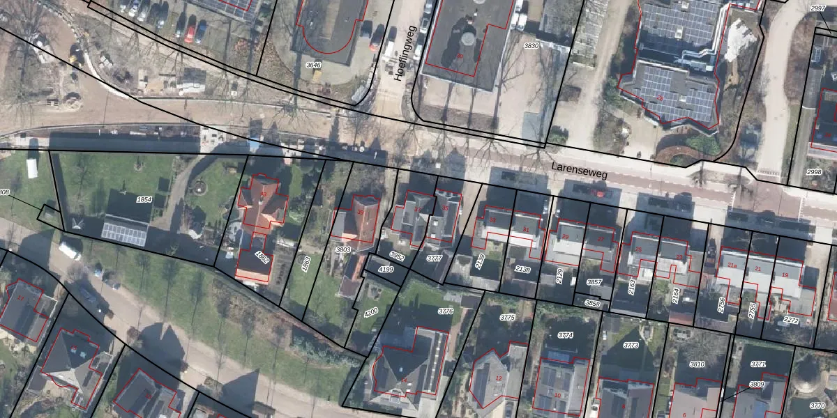 Larenseweg 37 is gelegen op kadastraal perceel LCM00E3952. Deze kadastrale aanduiding is uniek en wordt gebruikt door het Kadaster om eigendomsrechten en andere zakelijke rechten vast te leggen. Het perceel maakt onderdeel uit van de kadastrale gemeente Lochem.