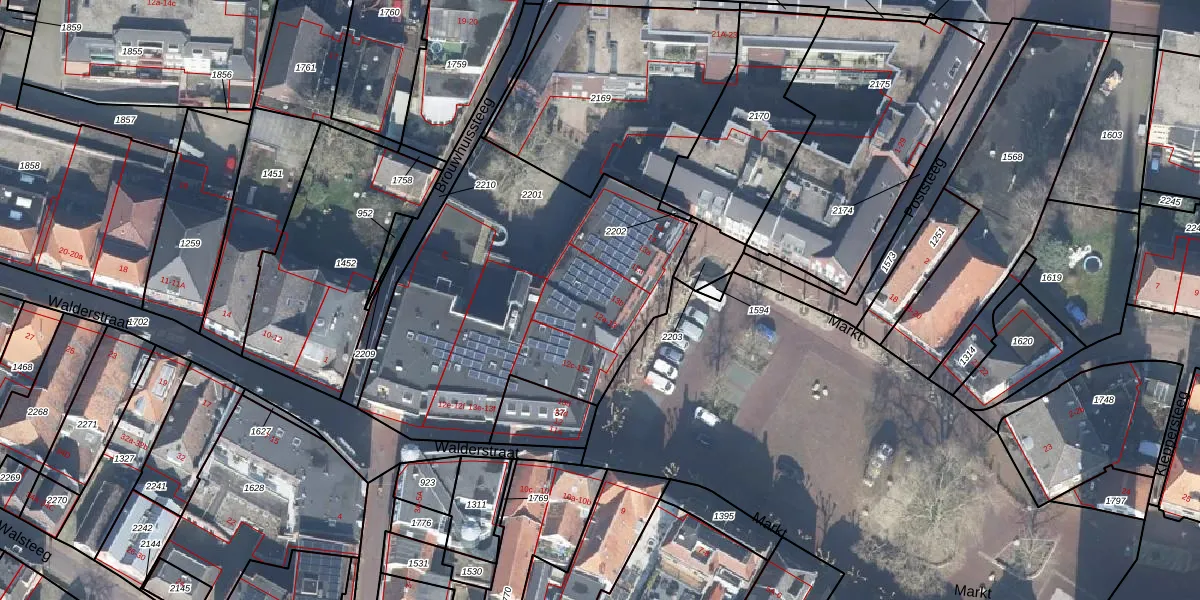 Het perceel waarop Markt 12-b staat heeft een oppervlakte van 1697 m². Dit is een zeer groot perceel. De perceeloppervlakte wordt geregistreerd door het Kadaster. Gedetailleerde informatie over de maten van dit perceel kunt u vinden in het rapport Kadastrale kaart met maatvoering van Markt 12-b.