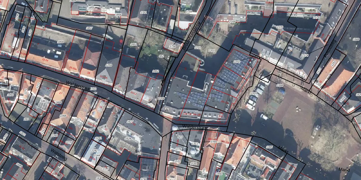 Het perceel waarop Markt 13-h staat heeft een oppervlakte van 1697 m². Dit is een zeer groot perceel. De perceeloppervlakte wordt geregistreerd door het Kadaster. Gedetailleerde informatie over de maten van dit perceel kunt u vinden in het rapport Kadastrale kaart met maatvoering van Markt 13-h.