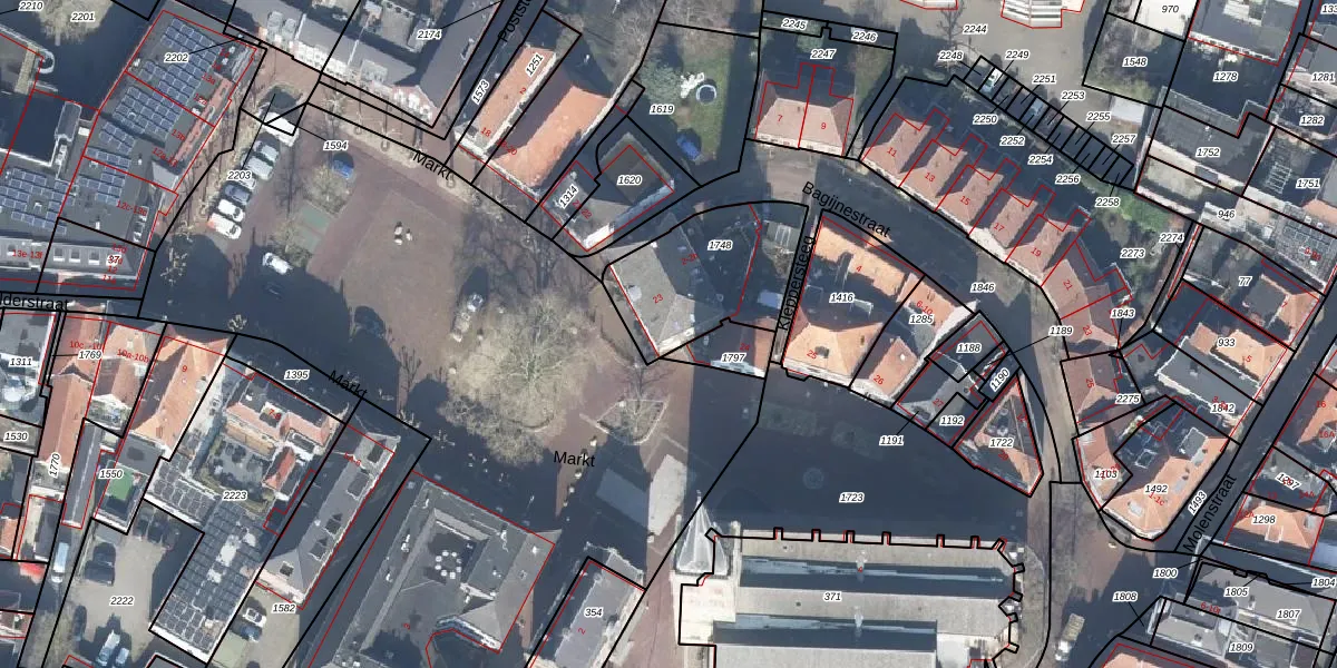 Het perceel waarop Markt 23 staat heeft een oppervlakte van 450 m². Dit is een groot perceel. De perceeloppervlakte wordt geregistreerd door het Kadaster. Gedetailleerde informatie over de maten van dit perceel kunt u vinden in het rapport Kadastrale kaart met maatvoering van Markt 23.