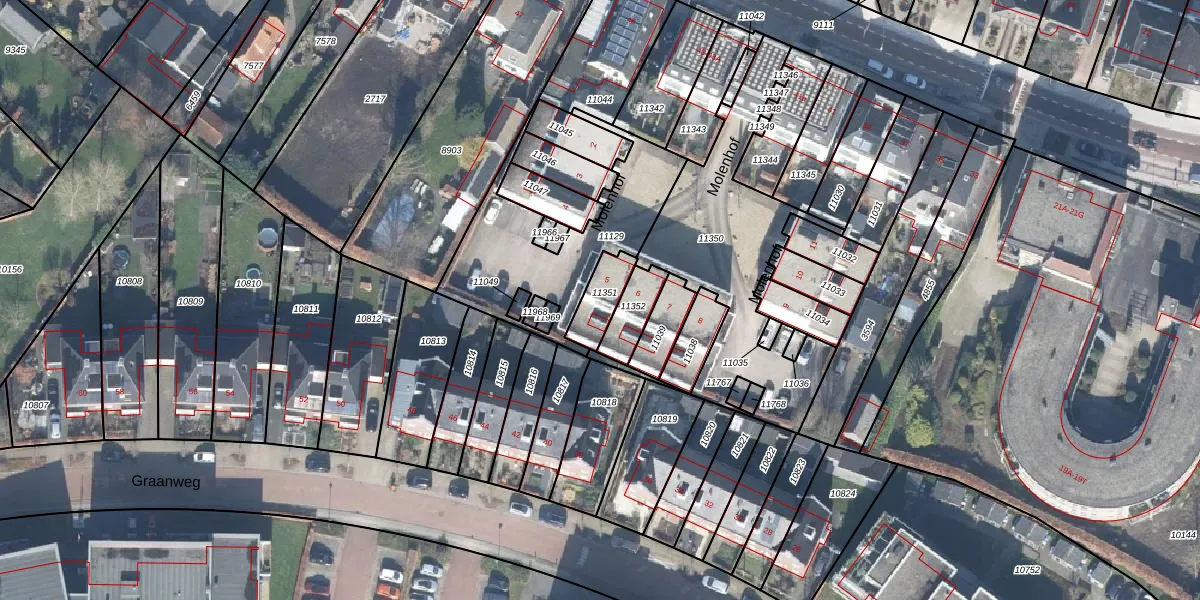 Het perceel waarop Molenhof 5 staat heeft een oppervlakte van 95 m². Dit is een klein perceel. De perceeloppervlakte wordt geregistreerd door het Kadaster. Gedetailleerde informatie over de maten van dit perceel kunt u vinden in het rapport Kadastrale kaart met maatvoering van Molenhof 5.