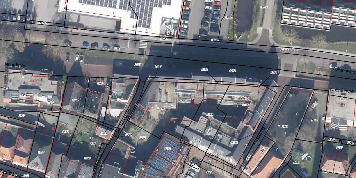 Het perceel waarop Noorderwal 22-d staat heeft een oppervlakte van 960 m². Dit is een groot perceel. De perceeloppervlakte wordt geregistreerd door het Kadaster. Gedetailleerde informatie over de maten van dit perceel kunt u vinden in het rapport Kadastrale kaart met maatvoering van Noorderwal 22-d.