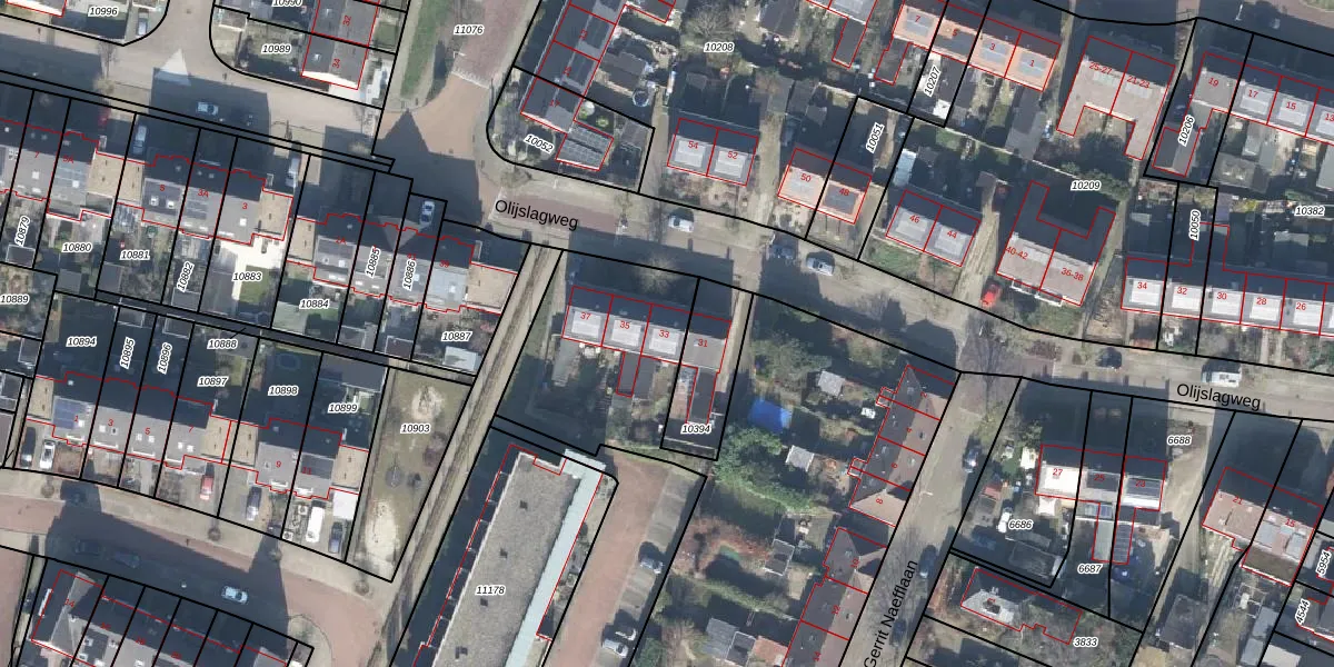 Het perceel waarop Olijslagweg 33 staat heeft een oppervlakte van 5664 m². Dit is een zeer groot perceel. De perceeloppervlakte wordt geregistreerd door het Kadaster. Gedetailleerde informatie over de maten van dit perceel kunt u vinden in het rapport Kadastrale kaart met maatvoering van Olijslagweg 33.