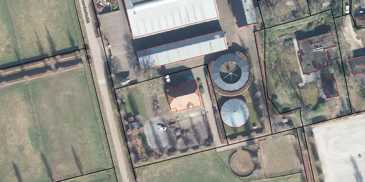 Het perceel waarop Ossenbeltsdijk 5 staat heeft een oppervlakte van 2490 m². Dit is een zeer groot perceel. De perceeloppervlakte wordt geregistreerd door het Kadaster. Gedetailleerde informatie over de maten van dit perceel kunt u vinden in het rapport Kadastrale kaart met maatvoering van Ossenbeltsdijk 5.