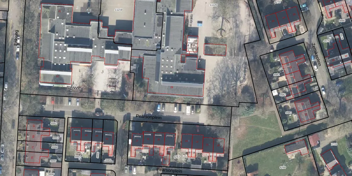 Het perceel waarop Pearsonplein 23 staat heeft een oppervlakte van 4120 m². Dit is een zeer groot perceel. De perceeloppervlakte wordt geregistreerd door het Kadaster. Gedetailleerde informatie over de maten van dit perceel kunt u vinden in het rapport Kadastrale kaart met maatvoering van Pearsonplein 23.