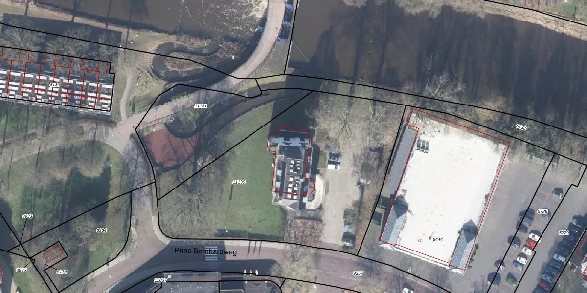 Het perceel waarop Prins Bernhardweg 7 staat heeft een oppervlakte van 2975 m². Dit is een zeer groot perceel. De perceeloppervlakte wordt geregistreerd door het Kadaster. Gedetailleerde informatie over de maten van dit perceel kunt u vinden in het rapport Kadastrale kaart met maatvoering van Prins Bernhardweg 7.