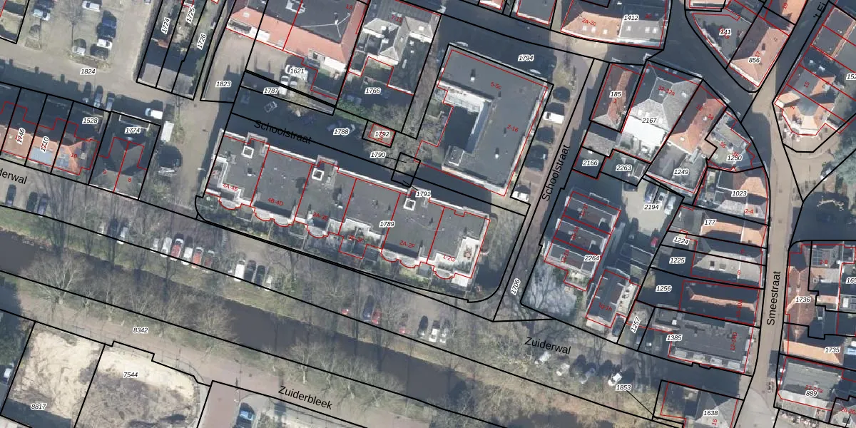 Het perceel waarop Zuiderwal 2-f staat heeft een oppervlakte van 1787 m². Dit is een zeer groot perceel. De perceeloppervlakte wordt geregistreerd door het Kadaster. Gedetailleerde informatie over de maten van dit perceel kunt u vinden in het rapport Kadastrale kaart met maatvoering van Zuiderwal 2-f.