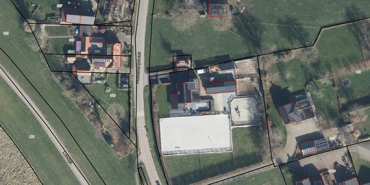 Het perceel waarop Husselarijstraat 43 staat heeft een oppervlakte van 3740 m². Dit is een zeer groot perceel. De perceeloppervlakte wordt geregistreerd door het Kadaster. Gedetailleerde informatie over de maten van dit perceel kunt u vinden in het rapport Kadastrale kaart met maatvoering van Husselarijstraat 43.